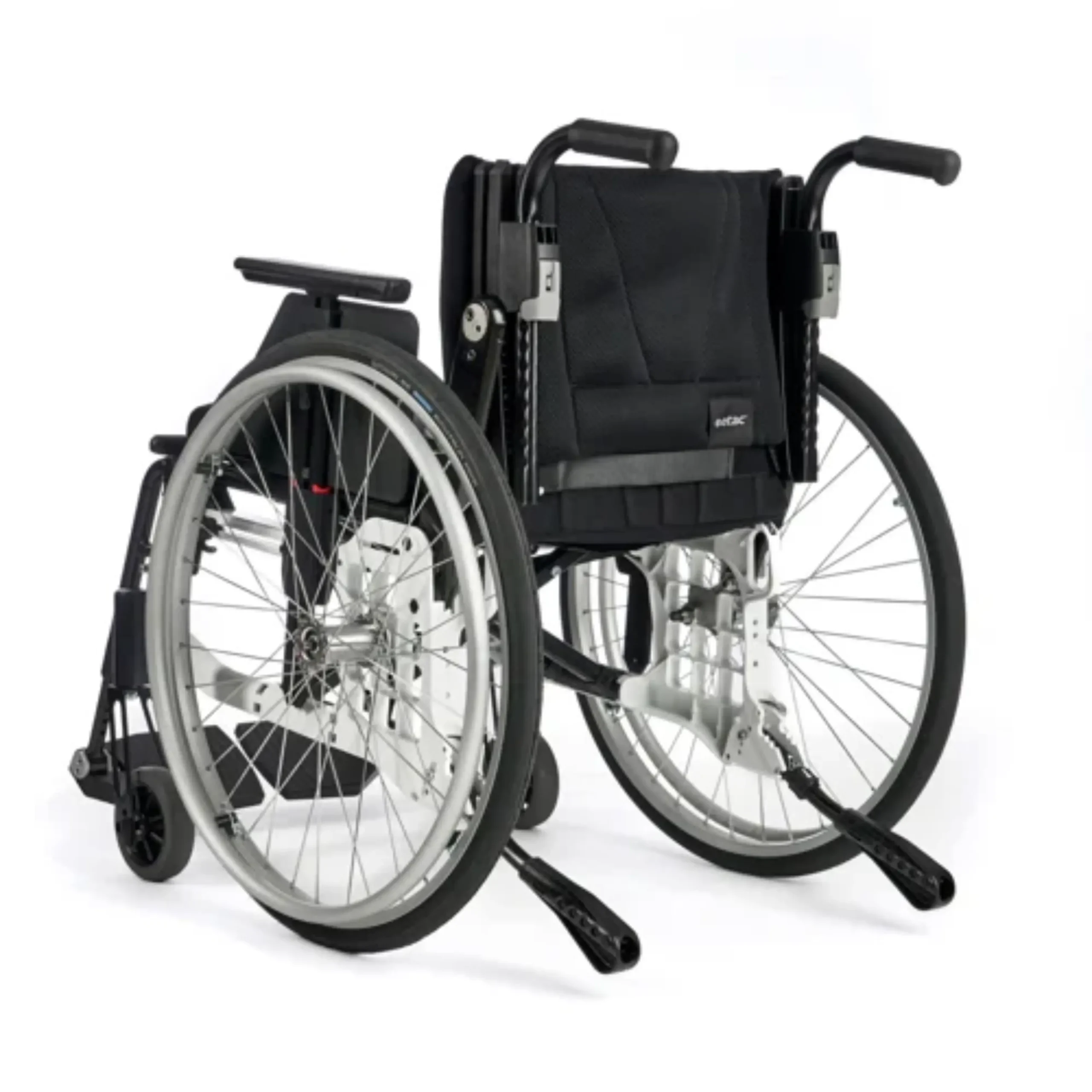 Weights and dimensions given are for a chair with 24″ rear wheels with quick-release hubs, high-pressure tire, aluminium handrims, leg supports, foot supports, brakes, arm supports, 6½” castors with medium forks. The measurements given may vary by +- 2%.