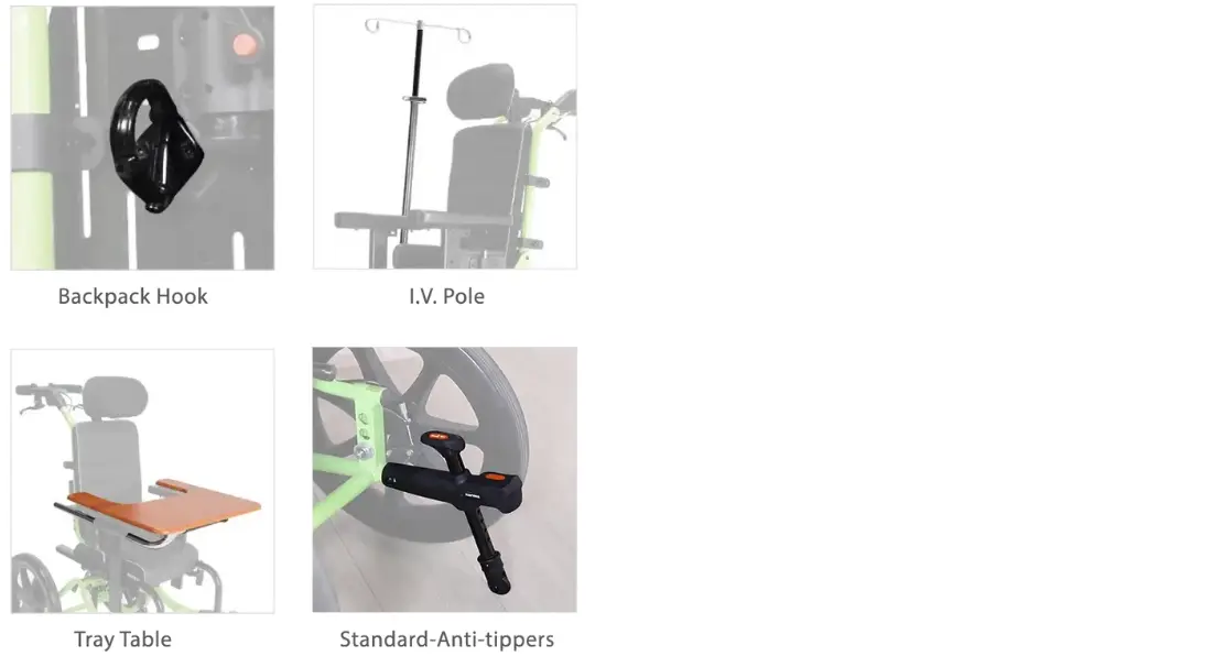 The adaptive seating system allows a wide range of accessory options for the ultimate personalization. The back panel’s slide-slot design and side rail technology facilitate the addition of different headrests, armrests, and supports.