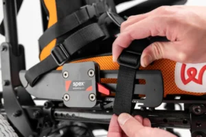 The arm supports are easy to remove using the quick-release mechanism to give parents and caregivers easy access during transfers. The anterior trunk support harness features front-access clips that make it easy to get little arms into place without needing to change the length of the harness. Wonderseat Space also features other quick-release and swing-away mechanisms allowing more of the hardware to be positioned away from the child.